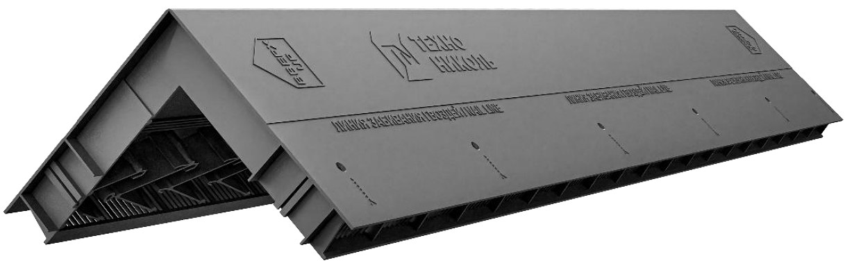 Стыковка по принципу «шип-паз» создает монолитную и геометрическую конструкцию. Продольный паз в центральной части позволяет сгибать аэратор по ровной линии. Усиленные линии крепежа. Не требует подреза коньково-карнизной черепицы при монтаже на аэратор.