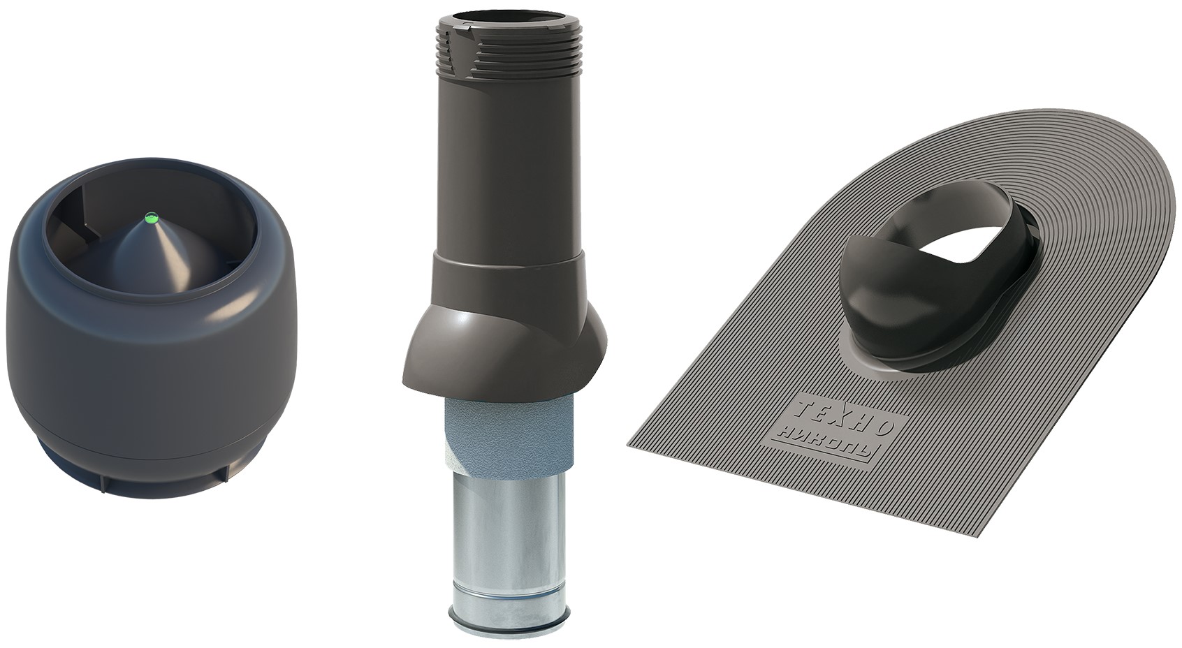 Комплект вентиляции Технониколь для гибкой черепицы 125/160 - комплект вентиляции для гибкой черепицы 125/160 состоит из набора изделий из полиэтилена низкого давления, включая проходной элемент, вентиляционный выход и колпак для вентиляционного выхода, предназначенных для обеспечения внутренней вентиляции в частных домах. Вентиляционный выход имеет внутренний диаметр трубы 125 мм и внешний — 160 мм.